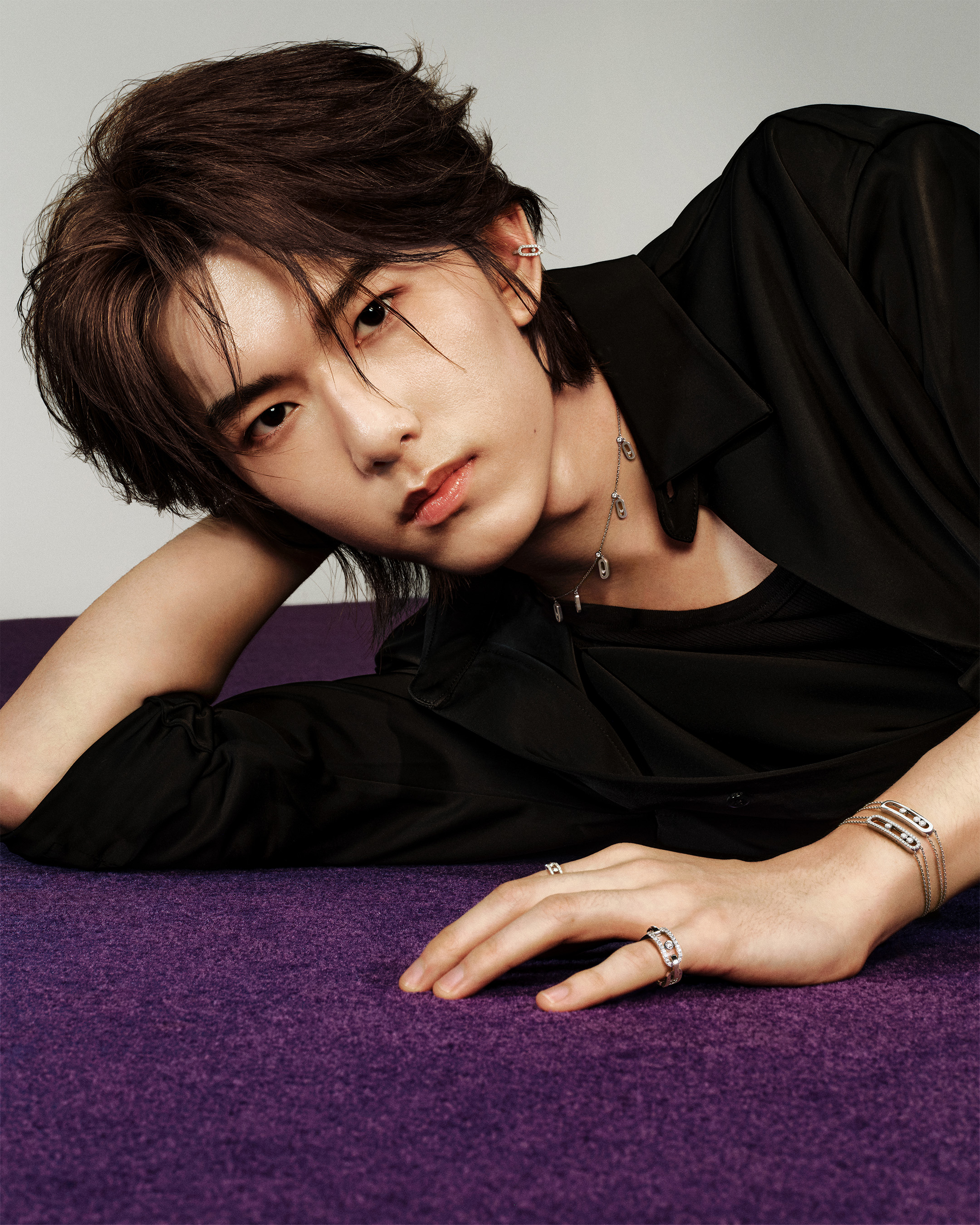 光影交错间,马柏全穿行于Messika标志性紫色构建的几何空间。流动的视觉语言将他的情绪缓缓包裹,亦将外界的喧嚣浮躁逐一过滤,无需关注, 不被定义。 身后的少年轮廓逐渐远去,前路的人生轨迹由自己点亮。他驻足于此,在回望与思索中,逐渐构建起清晰笃定的内心坐标。爱, 是内在的自信与⼒量,这份向内扎根的从容,既是无畏的底气,亦是爱的本质。